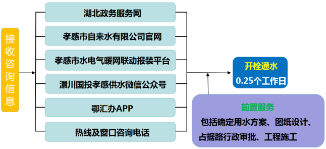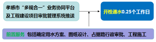 流程說明:供水企業通過孝感市“多規合一”業務協同平臺及工程建設項目審批管理系統推送獲取項目建設信息后主動對接,先行開展確定用水方案、圖紙設計、工程施工等服務,辦理用水工程涉及的占道、掘路、占用綠地、伐移樹木等相關行政審批手續,提前完成外線工程實施,為客戶提供“無感免申請”服務??蛻粜枰盟畷r,0.25個工作日內開栓通水。