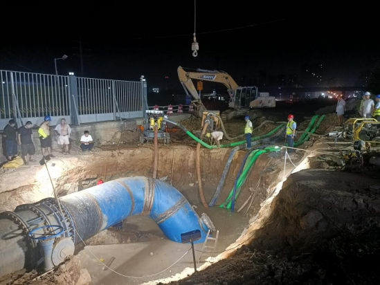 8月9日,雙方全力配合協(xié)作,提前完成了兩處遷移路段的基坑開挖和保護,以及閘閥接口端鋼管焊接和堵板等配件的制作。由于此次碰接施工作業(yè)需暫停管道運行,即施工期間需安排八一水廠和三水廠一期各1條DN1400原水管道停止進水,其間只能暫由三水廠二期維持供水,供水量將由近30萬噸/日銳減至15萬噸/日,造成較大范圍的降壓和部分管網(wǎng)末梢區(qū)域短時停水。為減少碰接施工對城區(qū)生產(chǎn)生活的影響,市自來水公司將施工作業(yè)時間主要安排在深夜用水低谷時段進行,并提前向社會發(fā)布公告,并安排專人分別通知相關(guān)工商企業(yè)和社區(qū)、小區(qū)居民,提醒市民提前儲水備用。同時還精心制訂了供水調(diào)度、錯峰停水方案和施工超時應(yīng)急預(yù)案,提前將兩座水廠的清水庫蓄至滿水位,以最大限度維持供水壓力,保障市民基本生活用水。