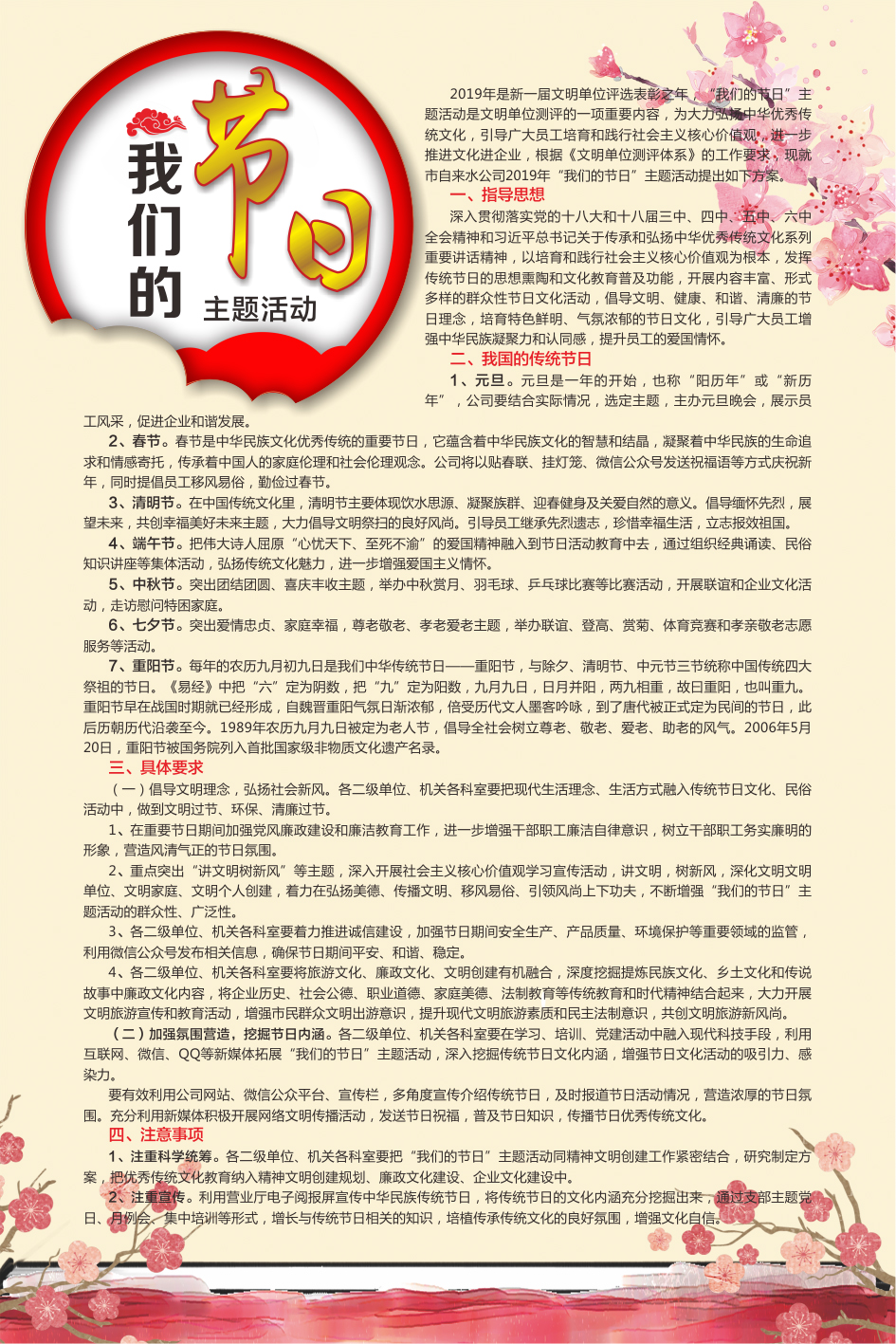 2019年是新一屆文明單位評選表彰之年,“我們的節日”主題活動是文明單位測評的一項重要內容,為大力弘揚中華優秀傳統文化,引導廣大員工培育和踐行社會主義核心價值觀,進一步推進文化進企業,根據《文明單位測評體系》的工作要求,現就市自來水公司2019年“我們的節日”主題活動提出如下方案。